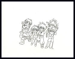 Now that I have them in hand, though, I have to say I'm really, really happy with this win. I believe they are authentic hankens. So far, I've identified three of the five images used on different merchandise for the show. And, they have raised linework on the front of the cel, which, I've been told, is the surest way to determine if something is an hanken or not. So, the closest I can figure is that these are some sort of hanken line cels, perhaps made in preparation for the creation of the finished artwork. Either way, I am thrilled to have them, and consider them a very nice addition to my gallery. ^.^